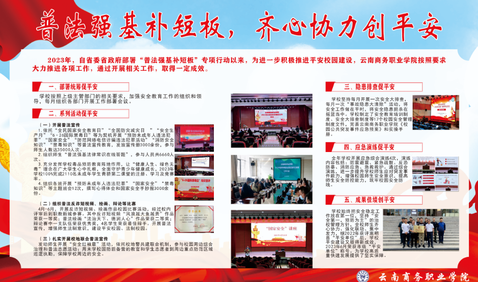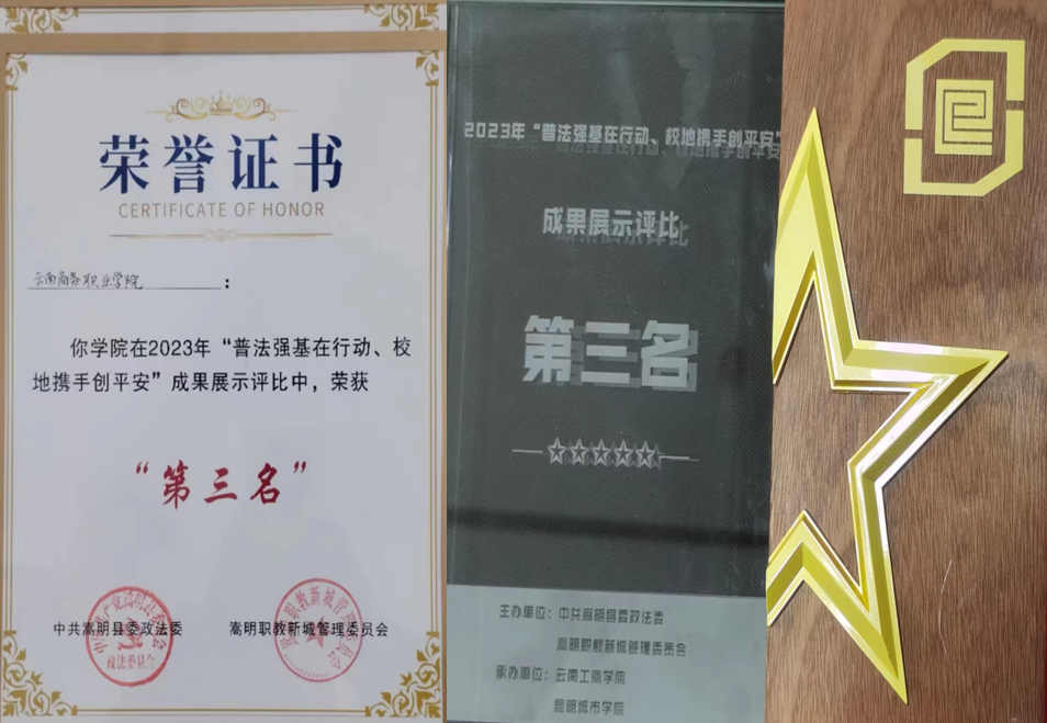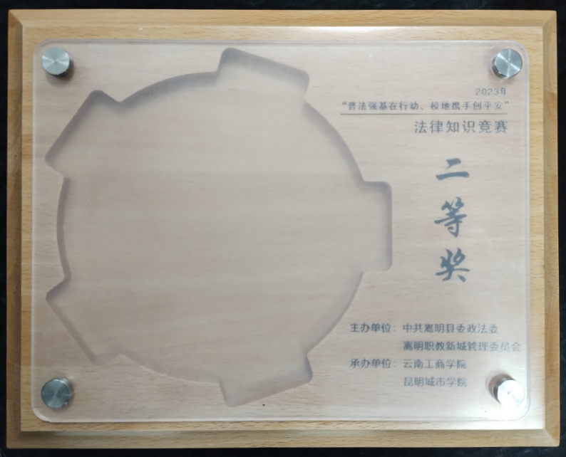为深入学习贯彻习近平总书记法治思想,全面落实“八五”普法规划要求,弘扬社会主义法治精神,加强学校法治文化建设,增强大学生尊法、守法、用法意识。12月14日,由中共嵩明县委、嵩明县人民政府主办,中共嵩明县委政法委员会、嵩明职教新城管理委员会、昆明城市学院、云南工商学院承办的2023年嵩明职教新城普法强基补短板专项行动;“普法强基在行动 校地携手创平安”系列活动在云南工商学院举行。经过激烈角逐,我校代表队荣获成果展示二等奖、法律知识竞赛“三等奖”。