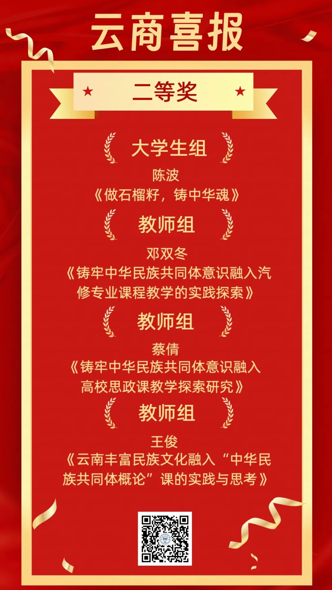 在云南省教育厅公布的《云南省教育厅 云南省民族宗教事务委员会关于公布2024年度云南省学校铸牢中华民族共同体意识教育征文活动获奖名单的通知》中,云商师生喜获二等奖四项。