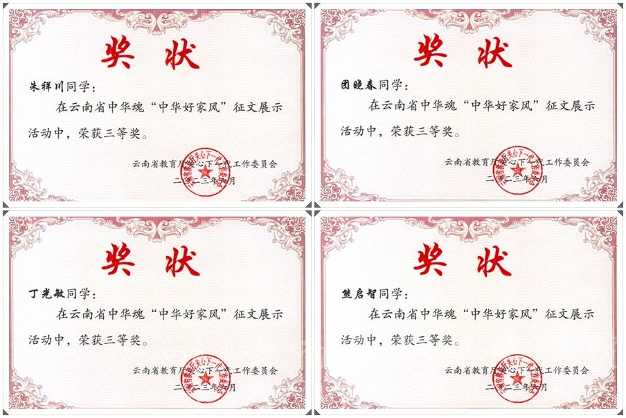 近日,由云南省教育厅关心下一代工作委员会主办的中华魂“中华好家风”主题征文、演讲活动赛果揭晓,学校5名同学获省级奖项,其中三等奖4人,优秀奖1人;3名教师获优秀辅导教师奖项。