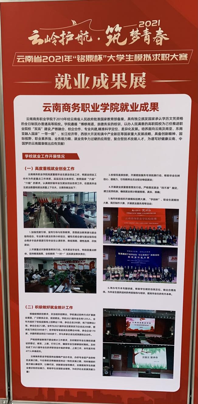 为贯彻党中央、国务院和省委、省政府关于做好“六稳”落实“六保”任务的决策部署,全力做好我省高校毕业生就业指导工作,发挥人力资源服务行业在促进就业创业方面的职能优势,加大就业服务工作力度,创新就业指导模式,引导大学生了解用人单位需求,根据《云南省教育厅云南省人力资源和社会保障厅关于举办云南省2021年铭鼎杯”大学生模拟求职大赛的通知》文件精神,2021年12月3日-5日SUNBET申搏参加云南省2021年“铭鼎杯”大学生模拟求职大赛省级赛。