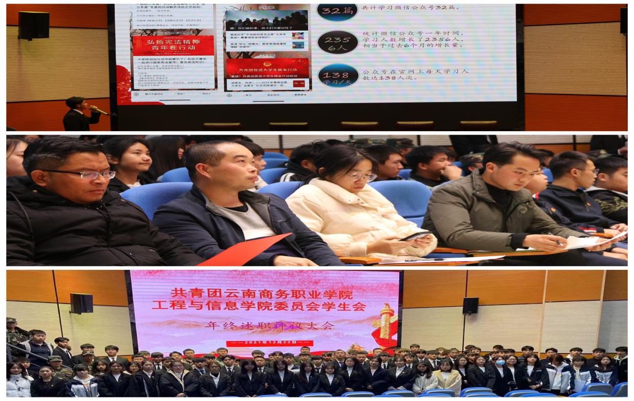 为全面贯彻落实以习近平同志为核心的党中央对共青团和青少年工作的各项重要指示精神,提高全团工作部署的落实成效,增强团组织政治性、先进性、群众性,推动基层团组织组织力、引领力、服务力和大局贡献度协调提升。依据《中国共产主义青年团支部工作条例(试行)》、《基层团组织书记述职评议考核暂行办法》(团组字〔2021〕1号)等文件精神,结合团中央、团省委相关工作安排,2021年12月22日,工程与信息学院团委在云商二号报告厅组织召开2021年团委年终工作述职评议会,工程与信息学院党支部副书记宁娇,工程与信息学院党支部青年委员何志慧工程与信息学院团总支书记魏祖林,工程与信息学院学生会组织秘书长邓双冬和团员青年代表共90人参加会议。学院16个团支部依次进行了年度述职汇报。