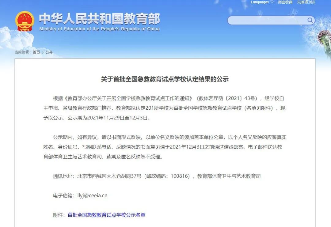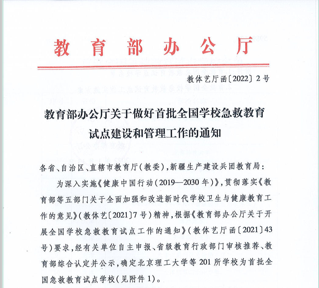 为深入实施《健康中国行动(2019-2030年)》,贯彻落实《教育部等五部门关于全面加强和改进新时代学校卫生与健康教育工作的意见》精神,2021年10月,教育部下发《教育部办公厅关于开展全国学校急救教育试点工作的通知》,决定实施青少年急救教育行动计划,开展全国学校急救教育试点工作。该项试点工作以提升学生健康素养为核心,以普及急救知识和技能为重点,以提高校园应急救护能力为目标。试点建设任务包括:普及校园急救知识、配备校园急救设施、开展应急救护培训等。经学校自主申报、省级教育行政部门审核推荐,教育部综合认定并公示,确定201所学校为首批全国急救教育试点学校。