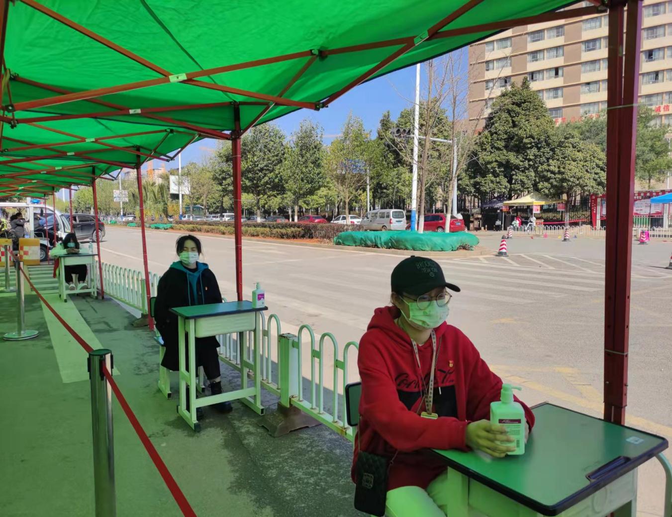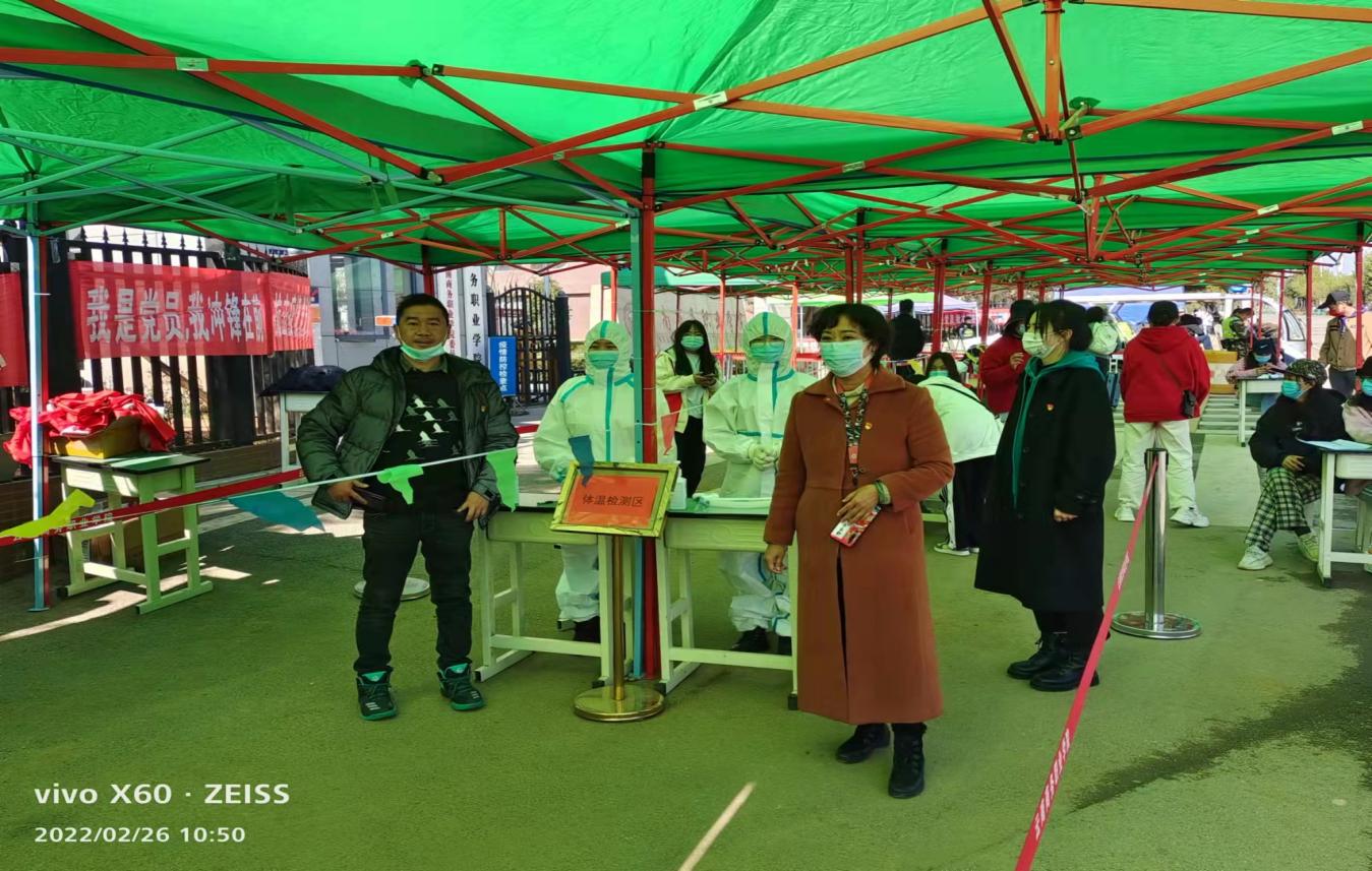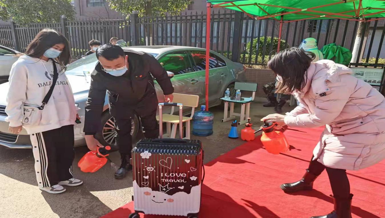 会议结束后,在郭爱梅书记和徐林勇副书记的带领下,全体党员与全院教师分成小组轮流在校门口执勤,定岗定责为学生重返校园做好材料检查、体温测量、消毒查杀等。