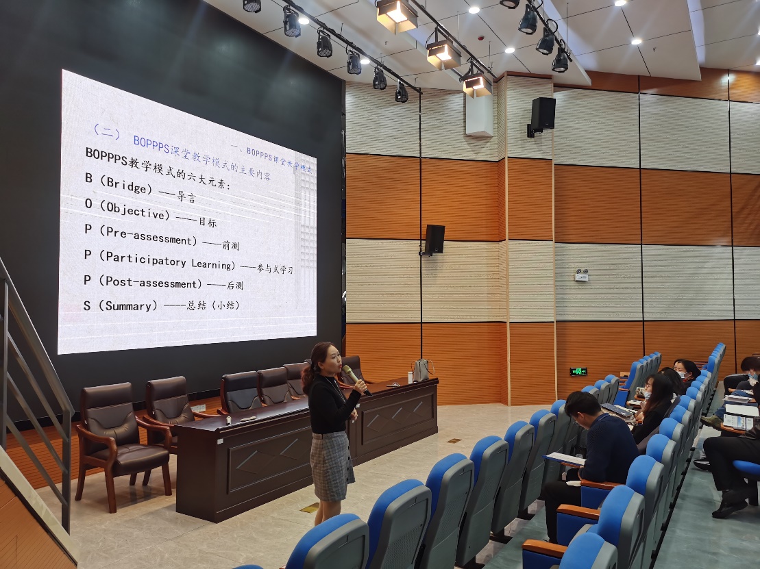 高职教育培养的是高素质技术技能人才,强调以能力培养为主线,课堂教学围绕以学生为中心,教师为主导,构建一种学生为主体的参与式学习模式。目前,我校绝大部分的课堂仍旧沿用传统的知识传授教师讲,学生听。学生被动学习的方式,已远不能满足职业人才培养的需求。周彬副教授用深入浅出的事例和生动的图片,向大家介绍了理实一体化、行为导向、能力本位、同频共振的教学理念。围绕BOPPPS课堂教学模式起源、主要内容进行讲授,重点就BOPPPS六个环节,即B(导入)-O(教学目标)-P(前测)-P(参与式活动)-P(后测)-S(总结)等内涵及如何开展进行解读。她特别强调,BOPPPS结构的各个环节是相互协作配合的,必须以教学目标为导向,以学生为中心,关注学习进度,强调知识的自我构建,促进学习的真实发生,最终才能实现有效学习。