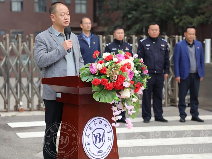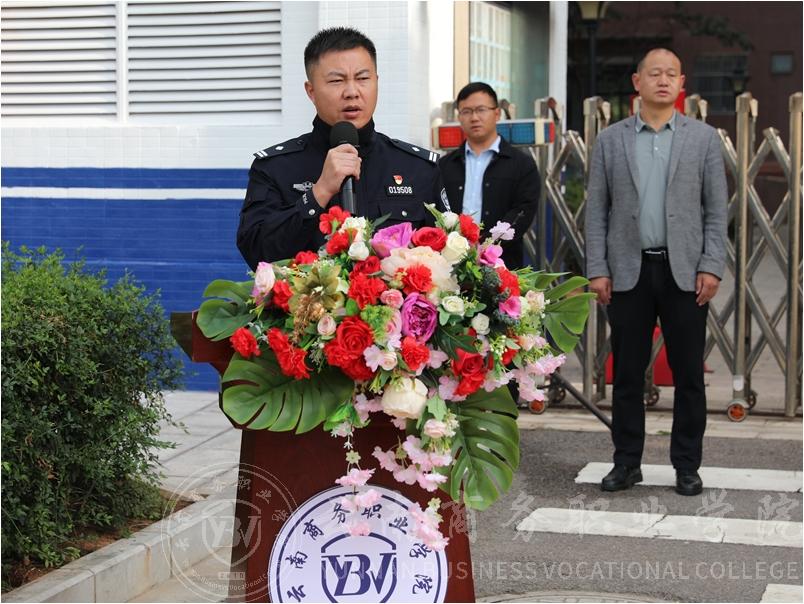 李晓明副所长在仪式上致辞。他强调,建设“校园110”是嵩明公安和云商积极贯彻落实昆明市人民政府、云南省教育厅关于加强校地联动推进驻昆高校校园及周边治安问题综合治理工作方案的通知要求的重要一环,希望学校在接下来的安全管理中,充分发挥好“校园110”的作用,真正把压降警情及安全工作落到实处。
