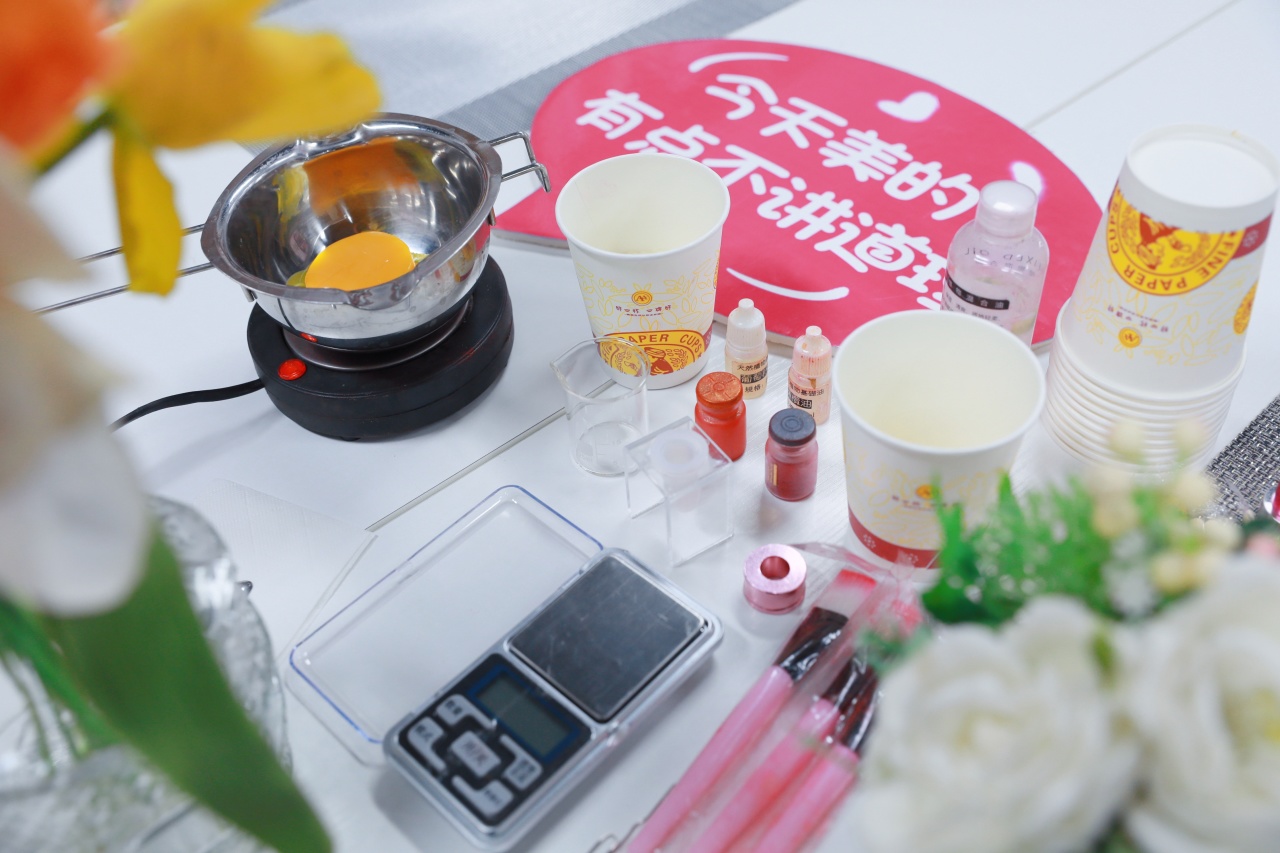 随后,“匠心手作,定制专属色彩”口红DIY环节将现场气氛推向高潮。专业手工导师从原料配比、调色技巧到安全事项进行详细讲解,女教职工们化身“美妆科学家”,专注地调配色粉、加热搅拌、灌装模具。精密操作与艺术创作的灵感碰撞,让现场充满欢声笑语。